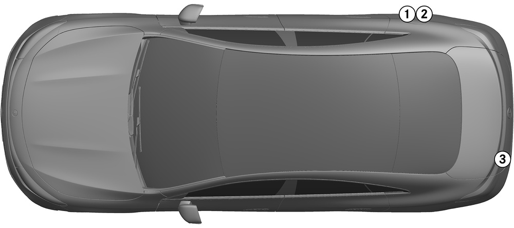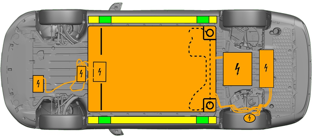 Strichzeichnung des Fahrzeugs mit Markierungen der sicherheitsrelevanten Komponenten und Rettungspunkten.