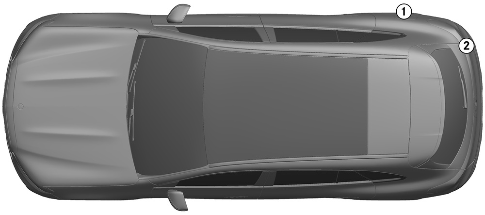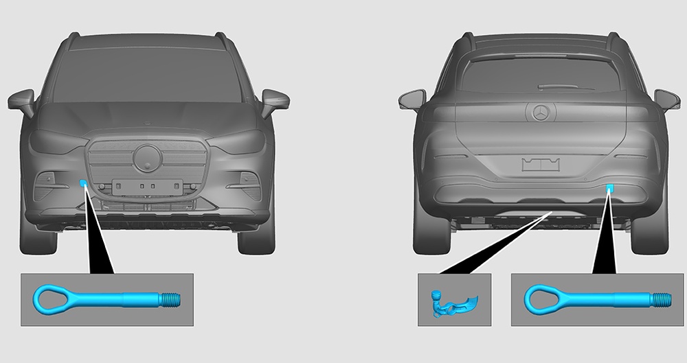 Strichzeichnung des Fahrzeugs mit Markierungen der sicherheitsrelevanten Komponenten und Rettungspunkten.