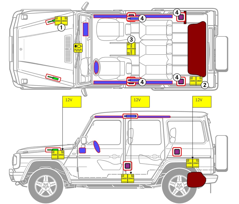 Γραμμικό σχέδιο του οχήματος με σήμανση των εξαρτημάτων που σχετίζονται με την ασφάλεια και των σημείων διάσωσης.