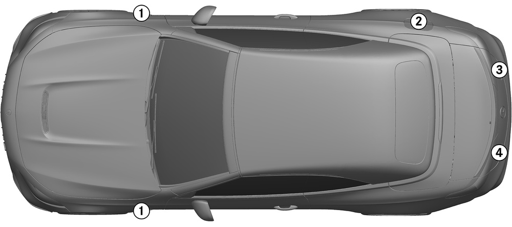 Line drawing of vehicle with markings of safety-relevant components and rescue points.